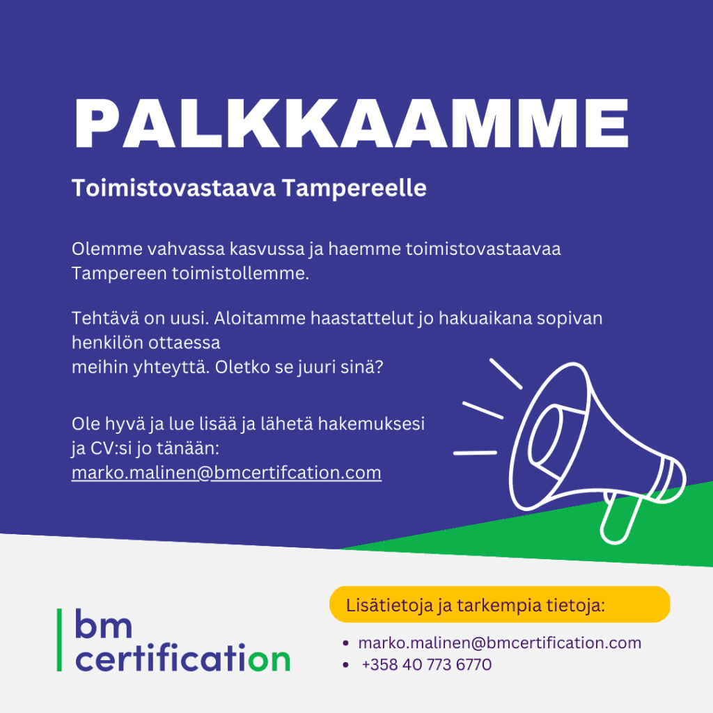 Ole hyvä ja lue lisää ja lähetä hakemuksesi ja CV:si jo tänään: marko.malinen@bmcertifcation.com